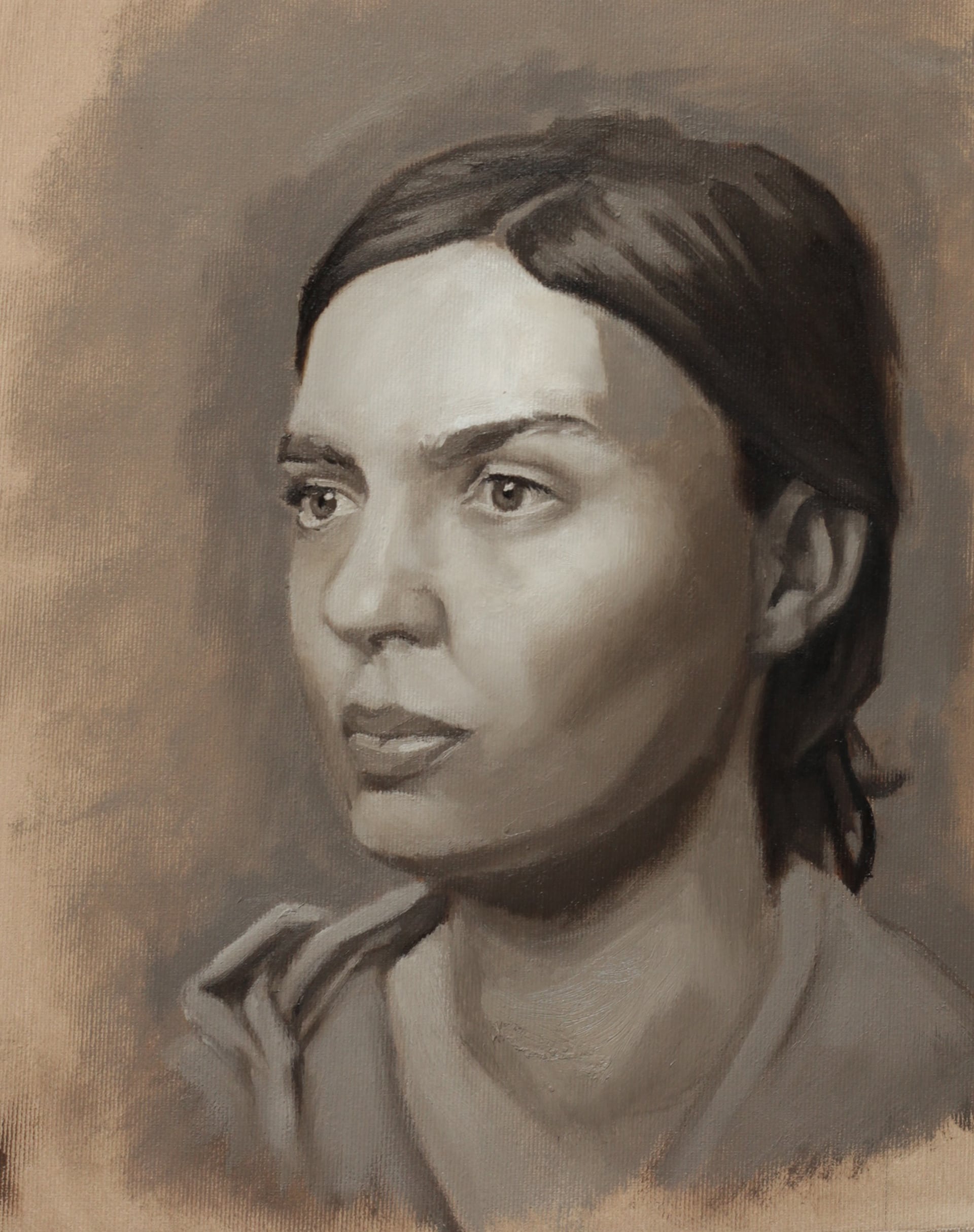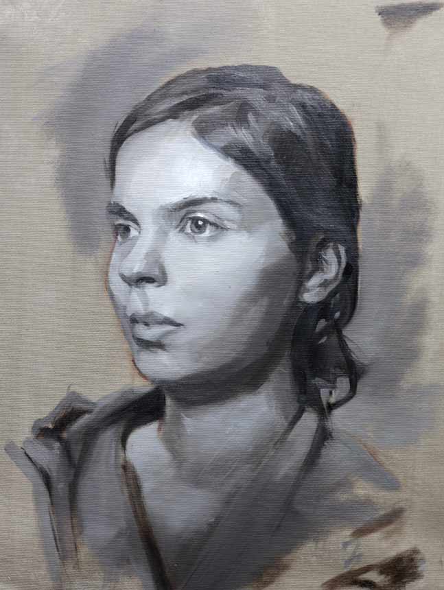 This is the second of the Grisaille exercises. For the first Grisaille Louis demonstrated each step to familiarise the students with the process. This technique is different to the Wash Drawing as we are now mixing the tonal ranges using black and white paint. The class has now progressed to using three colours for the Grisaille. Burnt Umber, Black and White. For the first Grisaille students will learn how to mix burnt umber and black to a consistent neutral gray that is neither to cool or warm. Learn how to mix tones, and how to judge tonal relationships.